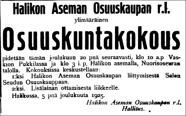 KLIKKAA KUVA ISOMMAKSI! Auto-keskus Uusi Aura 14.01.1925 Luumylly Halikkoon Salon Seudun Kunnallislehti 16.01.1925 "Uusi luumylly Salon seudulle. Liikemies A.B.Andtback on perustanut omistamalleen Tammiston tilalle Halikkoon uuden luumyllyn, jossa walmistetaan luuryynejä kanoille. Myllyssä on aiwan uudet nykyaikaiset koneet. Kun tähän asti on luuryynit tuotu ulkomailta ja meillä annetaan luiden mädäntyä asuntojen nurkkiin, on sanomattakin selwää kuinka tärkeä ja terwetullut tällainen laitos on paikkakunnalle. Wiittaamme ilmoitukseen." Perätön uutinen Salon Seudun Kunnallislehti 16.01.1925 "Oikaisu. Lehtemme tämän wuoden No:ssa 1 ollut uutinen otsakkeella "Ruma teko" on pidetyn poliisitutkinnon perusteella osoittanut aiwan perättömäksi ainakin siihen henkilöön nähden, johon uutisessa on, nimeä mainitsematta, wiitattu. Rakennuksen seinästä ei myöskään ole löydetty mitään ampumisen merkkejä. Walitamme, että olemme tällaisen perättömän uutisen joutuneet lehteemme ottamaan." Ruokatarjoilu Elanto Salon Seudun Kunnallislehti 16.01.1925 " — Elinkeinoluwat. Läänin maaherra on oikeuttanut Salon kauppalassa asuwan emännöitsijä Signe Agnes Caweniuksen harjoittamaan Salon kauppalassa ruokala- ja kahwilaliikettä toiminimellä "Ruokatarjoilu Elanto"." Luuryynejä kanoille Salon Seudun Kunnallislehti 16.01.1925 Kenen on syy? Salon Seudun Kunnallislehti 16.01.1925 Päivälista Salon Seudun Kunnallislehti 16.01.1925 Vuonna 1925 posti kannettiin kotiin kauppalassa myös sunnuntaisin... Lukkariurkurin wirkaan Salon Seudun Kunnallislehti 20.01.1925 "Angelniemi Angelniemen lukkari-urkurinwirka. Waltakirja Angelniemen lukkariurkurinwirkaan on annettu lukkariurkurikokelaalle E.E.Kaweniukselle, Halikosta. " Kokous osuuskaupan perustamisesta Salon Seudun Kunnallislehti 20.01.1925 "Halikko Osuuskauppa Waskiolle Toissa sunnuntaina oli waskiolaisia kokoontunut keskustelemaan uuden osuuskaupan perustamisesta sinne. Kauppa päätettiinkin perustaa ja hywäksyttin sääntöehdotus, jolle wahwistuksen hakee opettaja O.E.Rynkä. Liikkeen hallitukseen walittiin Paawo Kirstilä, Einar Mäkinen, Oskari Siren, Ewald Laine, Aug. Laaksonen, O.E.Rynkä sekä waralle K.E.Nurmi, A.Helenius ja August Koski. Heti sen jälkeen pitämässään kokouksessa walitsi hallitus puheenjohtajakseen P.Kirstilän, rahastonhoitajakseen E.Laineen ja kirjurikseen O.E.Ryngän. Halikon aseman Osuuskaupalle päätettiin tehdä ehdotus, että se myisi uudelle osuuskaupalle Waskiolla olewan haaramyymälänsä. " Sinivuokkoja ja kanttarelleja Salon Seudun Kunnallislehti 20.01.1925 Myrskyn vahinkoja Turun Sanomat 21.01.1925 "Maanantainen myrsky Perniön Kirkonkylän puhelinkeskuksessa lyhytsulku saanut aikaan tulipalonalun. Wiime maanantainen myrsky teki tuhoja kaikkialla maakunnassa, katkaisten m.m. puhelin- ja sähköpylwäitä, josta johtuikin, että puhelu keskeytyi monelle paikkakunnalle ja usea pitäjä sai olla pimeyden wallassa pitemmän aikaa. Perniön puhelinkeskuksessa oli sähköhäiriö saada aikaan tuhoisan tulipalon. Perniön Paarskylässä oli nimittäin sähköjohtolanka myrskyn waikutuksesta katkennut ja joutunut yhteyteen puhelinlankojen kanssa, josta johtui, että Kirkonkylän keskuksessa syntyi lyhytsulku, joka sai aikaan tulipalon keskuksessa. Keskuksen reipas neitonen sai kuitenkin tulen sammutetuksi, ennenkuin se ehti tehdä suurempia tuhoja ja katkaistua winnillä olewien waralaitteiden langat." Kahvila- ja ruokatarjoiluliike Salon Seudun Kunnallislehti 23.01.1925