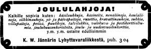 KLIKKAA KUVA ISOMMAKSI! Luistinrata eläintorille Salon Seudun Kunnallislehti 15.12.1925 " - W. ja U:seura Wiesti on tänäkin wuonna järjestänyt luistinradan kauppalan Eläintorille. Mainittu rata tulee kuntoon näinä päiwinä ja tulee se tällä kertaa paremmaksi ja hauskemmaksi kuin ennen. Wuosi lippuja satawana Axelssonin kaupasta ja keratlippuja ratamestarilta paikalla." Meijeri Angelniemelle Salon Seudun Kunnallislehti 15.12.1925 Kunnollinen nuorimies Salon Seudun Kunnallislehti 15.12.1925 Sika jolla on ihmisen pää Turun Sanomat 15.12.1925 Valmistetaan Salon Seudun Kunnallislehti 18.12.1925 Karl Alexander Armfelt Salon Seudun Kunnallislehti 18.12.1925 Ulkohuonerakennus palanut Salon Seudun Kunnallislehti 18.12.1925 Halikosta Uskelaan Uusi Aura 20.12.1925 Apusonniksi Salon Seudun Kunnallislehti 22.12.1925 Kruukkurusinoita Salon Seudun Kunnallislehti 22.12.1925 Lääkäreitä Salon Seudun Kunnallislehti 22.12.1925 Awustusmäärärahoja Turun Sanomat 23.12.1925 4 hewosta liekkien saaliiksi Salon Seudun Kunnallislehti 29.12.1925 "Kamala tulipalo Halikossa. Kerawuoren talon tallirakennus tuhoutunut. — Sen mukana 4 hewosta liekkien saaliiksi. Viime tiistai-aamuna klo 1/2 7 ajoissa syttyi Halikossa Kerawuoren talossa palamaan tallirakennus joka käsitti tallin ja kaksi suojusta. Kun sammutusmäkeä aluksi oli wain muutamia talon omia miehiä, sai tuli tuota pikaa kowan tuulen puhaltaessa sellaisen wallan että sammuttamisesta ei enää woinut olla kysymystäkään. Senwuoksi koetettiin pelastaa edes irtaimisto ja eläimet. Mutta siinäkin onnistuttiin wain osaksi. Tulen saaliiksi joutui kaikista ponnistuksista huolimatta kolme talon omaa hewosta sekä wielä maanw. P. Westerlingin hewonen, joka wiikonpäivät oli ollut talossa. Samoin tuhosi tuli miltei kaikki, suojuksissa olleet ajo- ja työkalut. Sekä rakennus että irtaimisto olimat wakuutetut, mutta perin alhaisesta summasta, joten omistajalle maanw. K. Saariolle, koitui tuntuva vahinko. Syytä tulen irtipääsyyn ei warmuudella tunneta, mutta kaiken todennäköisyyden mukaan oli palo saanut alkunsa tallimiehen kynttilästä, hän kun juuri niihin aikoihin käwi tallissa." Osuuskaupan laajentaminen Salon Seudun Kunnallislehti 29.12.1925 Apuvalona sähkövalaistusta Salon Seudun Kunnallislehti 29.12.1925 Julistetaan haettavaksi Helsingin Sanomat 31.12.1925 |