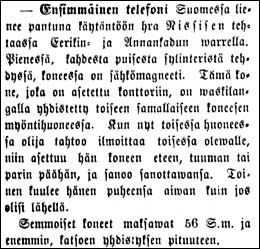 — Ensimmäinen telefoni Suomessa lienee pantuna käytäntöön hra Rissisen tehtaassa Eerikin- ja Annankadun warrella. Pienessä, kahdessa puisesta sylinteristä tehdyssä, koneessa on sähkömagneetti. Tämä kone, joka on asetetttu konttoriin, on waskilangalla yhdistetty toiseen samallaiseen koneeseen myöntihuoneessa. Kun nyt toisessa huoneessa olija tahtoo ilmoittaa toisessa olewalle, niin asettuu hän koneen eteen, tuuman tai parin päähän, ja sanoo sanottawansa. Toinen kuulee hänen puheensa aiwan kuin jos olisi lähellä.