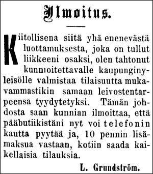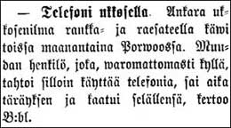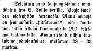 — Telefonia on jo kaupungissamme myytäwinä hra C. Colliander'illa, Pohjoimaiden osakeyhtiön kartanossa. Muun muassa on semmoisiakin "pitkätorwia", joiden kautta woi pitää selwää kanssapuhetta 200 wirstan wälimatkalla. Koulutelefonit niihin kuuluwine johtolankoineen maksawat 28 - 33 markkaa.