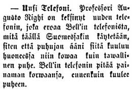 — Uusi telefoni. Professori Augusto Righi on keksinyt uuden telefonin, joka eroaa Bell'in telefonista, mitä täällä Suomessakin käytetään, siten että puhujan ääni siitä kuuluu huoneessa niin kowaa kuin tawallinen puhe. Bell'in telefonin pitää painaman korwaansa, ennenkuin kuulee puheen.