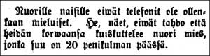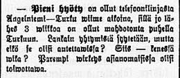 — Pieni hyöty on ollut telefoonilinjasta Angelniemi-Turku wiime aikoina, sillä jo lähes 3 wiikkoa on ollut mahdotonta puhella Turkuun. Lankain yhtymistä syytetään, mutta eikö se olisi autettawissa? Siis — kenessä wika? Parempi wirkeys asianomaisissa olisi toiwottawa.