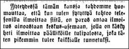 Yhteydessä tämän kanssa tahdomme huomauttaa, että kun tulen sytyttyä tahtoo telefonilla ilmoittaa siitä, on paras antaa ilmoitus ainoastaan keskus-asemaan, jolla on käsky heti ilmoittaa päälliköille tulipalosta, joka täten pikemmin tulee kaikkialle tunnetuksi.