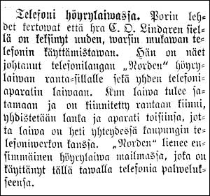 Telefoni höyrylaiwassa. Porin lehdet kertowat että hra C.D.Lindgren siellä on keksinyt uuden, warsin mukawan telefonin käyttämistawan. Hän on näet johtanut telefonilangan "Norden" höyrylaiwan ranta-sillalle sekä yhden telefoniaparatin laiwaan. Kun laiwa tulee satamaan ja on kiinnitetty rantaan kiinni, yhdistetään lanka ja aparati toisiinsa, jotta laiwa on heti yhteydessä kaupungin telefoniwerkon kanssa. "Norden" lienee ensimmäinen höyrylaiwa mailmassa, joka on käyttänyt tällä tawalla telefonia palwelukseensa.