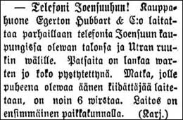 — Telefoni Joensuuhun! Kauppahuone Egerton Hubbart & C:o laitattaa parhaillaan telefonia Joensuun kaupungissa olewan talonsa ja Ultran ruukin wälille. Patsaita on lankaa warten jo koko pystytettynä. Matka, jolle puheena olewaa äänen kiidättäjää laitetaan, on noin 6 wirstaa. Laitos on ensimmäinen paikkakunnalla.