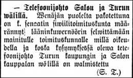— Telefoonijohto Salon ja Turun wälillä. Wenäjän puolelta pakotettuna on k. senaatin siwiilitoimituskunta määrännyt lääninkuwernöörin selwittämään mainitulle toimituskunnalle millä oikeudella ja koska kysymyksessä olewa telefoonijohto Turun kaupungin ja Salon kauppalan wälillä on walmistettu.