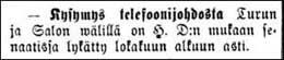— Telefonijohto Turun ja Salon wälillä on walmistunut ja puhuminen tuolla 5 pelikulman wälimatkalla käy hywin päinsä.