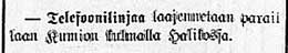 — Telefonia Jywäskylään ja sen lähiseudulle aikoo assessori Wadén Halingistä, laittaa, jos osanottajia tarpeeksi tulee.