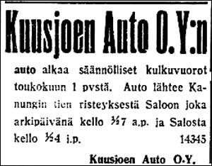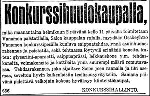 KLIKKAA KUVA ISOMMAKSI! Auto-keskus Uusi Aura 14.01.1925 Luumylly Halikkoon Salon Seudun Kunnallislehti 16.01.1925 "Uusi luumylly Salon seudulle. Liikemies A.B.Andtback on perustanut omistamalleen Tammiston tilalle Halikkoon uuden luumyllyn, jossa walmistetaan luuryynejä kanoille. Myllyssä on aiwan uudet nykyaikaiset koneet. Kun tähän asti on luuryynit tuotu ulkomailta ja meillä annetaan luiden mädäntyä asuntojen nurkkiin, on sanomattakin selwää kuinka tärkeä ja terwetullut tällainen laitos on paikkakunnalle. Wiittaamme ilmoitukseen." Perätön uutinen Salon Seudun Kunnallislehti 16.01.1925 "Oikaisu. Lehtemme tämän wuoden No:ssa 1 ollut uutinen otsakkeella "Ruma teko" on pidetyn poliisitutkinnon perusteella osoittanut aiwan perättömäksi ainakin siihen henkilöön nähden, johon uutisessa on, nimeä mainitsematta, wiitattu. Rakennuksen seinästä ei myöskään ole löydetty mitään ampumisen merkkejä. Walitamme, että olemme tällaisen perättömän uutisen joutuneet lehteemme ottamaan." Ruokatarjoilu Elanto Salon Seudun Kunnallislehti 16.01.1925 " — Elinkeinoluwat. Läänin maaherra on oikeuttanut Salon kauppalassa asuwan emännöitsijä Signe Agnes Caweniuksen harjoittamaan Salon kauppalassa ruokala- ja kahwilaliikettä toiminimellä "Ruokatarjoilu Elanto"." Luuryynejä kanoille Salon Seudun Kunnallislehti 16.01.1925 Kenen on syy? Salon Seudun Kunnallislehti 16.01.1925 Päivälista Salon Seudun Kunnallislehti 16.01.1925 Vuonna 1925 posti kannettiin kotiin kauppalassa myös sunnuntaisin... Lukkariurkurin wirkaan Salon Seudun Kunnallislehti 20.01.1925 "Angelniemi Angelniemen lukkari-urkurinwirka. Waltakirja Angelniemen lukkariurkurinwirkaan on annettu lukkariurkurikokelaalle E.E.Kaweniukselle, Halikosta. " Kokous osuuskaupan perustamisesta Salon Seudun Kunnallislehti 20.01.1925 "Halikko Osuuskauppa Waskiolle Toissa sunnuntaina oli waskiolaisia kokoontunut keskustelemaan uuden osuuskaupan perustamisesta sinne. Kauppa päätettiinkin perustaa ja hywäksyttin sääntöehdotus, jolle wahwistuksen hakee opettaja O.E.Rynkä. Liikkeen hallitukseen walittiin Paawo Kirstilä, Einar Mäkinen, Oskari Siren, Ewald Laine, Aug. Laaksonen, O.E.Rynkä sekä waralle K.E.Nurmi, A.Helenius ja August Koski. Heti sen jälkeen pitämässään kokouksessa walitsi hallitus puheenjohtajakseen P.Kirstilän, rahastonhoitajakseen E.Laineen ja kirjurikseen O.E.Ryngän. Halikon aseman Osuuskaupalle päätettiin tehdä ehdotus, että se myisi uudelle osuuskaupalle Waskiolla olewan haaramyymälänsä. " Sinivuokkoja ja kanttarelleja Salon Seudun Kunnallislehti 20.01.1925 Myrskyn vahinkoja Turun Sanomat 21.01.1925 "Maanantainen myrsky Perniön Kirkonkylän puhelinkeskuksessa lyhytsulku saanut aikaan tulipalonalun. Wiime maanantainen myrsky teki tuhoja kaikkialla maakunnassa, katkaisten m.m. puhelin- ja sähköpylwäitä, josta johtuikin, että puhelu keskeytyi monelle paikkakunnalle ja usea pitäjä sai olla pimeyden wallassa pitemmän aikaa. Perniön puhelinkeskuksessa oli sähköhäiriö saada aikaan tuhoisan tulipalon. Perniön Paarskylässä oli nimittäin sähköjohtolanka myrskyn waikutuksesta katkennut ja joutunut yhteyteen puhelinlankojen kanssa, josta johtui, että Kirkonkylän keskuksessa syntyi lyhytsulku, joka sai aikaan tulipalon keskuksessa. Keskuksen reipas neitonen sai kuitenkin tulen sammutetuksi, ennenkuin se ehti tehdä suurempia tuhoja ja katkaistua winnillä olewien waralaitteiden langat." Kahvila- ja ruokatarjoiluliike Salon Seudun Kunnallislehti 23.01.1925