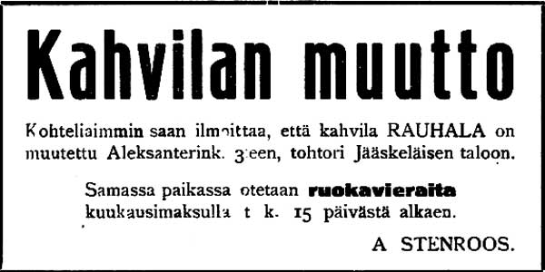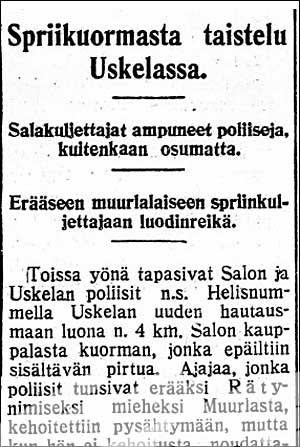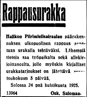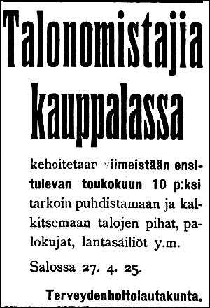KLIKKAA KUVA ISOMMAKSI! Luistinrata eläintorille Salon Seudun Kunnallislehti 15.12.1925 " - W. ja U:seura Wiesti on tänäkin wuonna järjestänyt luistinradan kauppalan Eläintorille. Mainittu rata tulee kuntoon näinä päiwinä ja tulee se tällä kertaa paremmaksi ja hauskemmaksi kuin ennen. Wuosi lippuja satawana Axelssonin kaupasta ja keratlippuja ratamestarilta paikalla." Meijeri Angelniemelle Salon Seudun Kunnallislehti 15.12.1925 Kunnollinen nuorimies Salon Seudun Kunnallislehti 15.12.1925 Sika jolla on ihmisen pää Turun Sanomat 15.12.1925 Valmistetaan Salon Seudun Kunnallislehti 18.12.1925 Karl Alexander Armfelt Salon Seudun Kunnallislehti 18.12.1925 Ulkohuonerakennus palanut Salon Seudun Kunnallislehti 18.12.1925 Halikosta Uskelaan Uusi Aura 20.12.1925 Apusonniksi Salon Seudun Kunnallislehti 22.12.1925 Kruukkurusinoita Salon Seudun Kunnallislehti 22.12.1925 Lääkäreitä Salon Seudun Kunnallislehti 22.12.1925 Awustusmäärärahoja Turun Sanomat 23.12.1925 4 hewosta liekkien saaliiksi Salon Seudun Kunnallislehti 29.12.1925 "Kamala tulipalo Halikossa. Kerawuoren talon tallirakennus tuhoutunut. — Sen mukana 4 hewosta liekkien saaliiksi. Viime tiistai-aamuna klo 1/2 7 ajoissa syttyi Halikossa Kerawuoren talossa palamaan tallirakennus joka käsitti tallin ja kaksi suojusta. Kun sammutusmäkeä aluksi oli wain muutamia talon omia miehiä, sai tuli tuota pikaa kowan tuulen puhaltaessa sellaisen wallan että sammuttamisesta ei enää woinut olla kysymystäkään. Senwuoksi koetettiin pelastaa edes irtaimisto ja eläimet. Mutta siinäkin onnistuttiin wain osaksi. Tulen saaliiksi joutui kaikista ponnistuksista huolimatta kolme talon omaa hewosta sekä wielä maanw. P. Westerlingin hewonen, joka wiikonpäivät oli ollut talossa. Samoin tuhosi tuli miltei kaikki, suojuksissa olleet ajo- ja työkalut. Sekä rakennus että irtaimisto olimat wakuutetut, mutta perin alhaisesta summasta, joten omistajalle maanw. K. Saariolle, koitui tuntuva vahinko. Syytä tulen irtipääsyyn ei warmuudella tunneta, mutta kaiken todennäköisyyden mukaan oli palo saanut alkunsa tallimiehen kynttilästä, hän kun juuri niihin aikoihin käwi tallissa." Osuuskaupan laajentaminen Salon Seudun Kunnallislehti 29.12.1925 Apuvalona sähkövalaistusta Salon Seudun Kunnallislehti 29.12.1925 Julistetaan haettavaksi Helsingin Sanomat 31.12.1925 |
