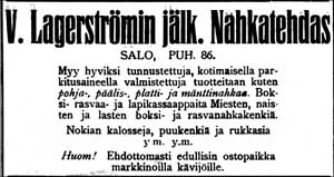 KLIKKAA KUVA ISOMMAKSI! Siisti ja puhdas Salon Seudun Kunnallislehti 25.09.1925 Suvannon myymälästä Salon Seudun Kunnallislehti 25.09.1925 Warkaat Turun Sanomat 25.09.1925 Kuramarkkinat Uusi Aura 26.09.1925