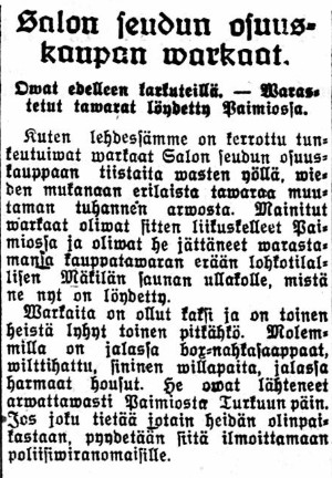 KLIKKAA KUVA ISOMMAKSI! Haluaville ilmoitetaan Salon Seudun Kunnallislehti 22.09.1925 Puukotus Wartsalassa Salon Seudun Kunnallislehti 22.09.1925 Hämmästyttäviä tuloksia Helsingin Sanomat 24.09.1925 Pysyväinen paikka Turun Sanomat 24.09.1925 Julistetaan haettavaksi Turun Sanomat 25.09.1925 Halvimmalla Salon Seudun Kunnallislehti 25.09.1925