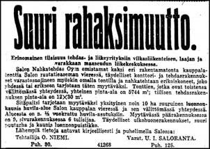 KLIKKAA KUVA ISOMMAKSI! Ilman lupaani Salon Seudun Kunnallislehti 20.11.1925 Awustuksia Turun Sanomat 21.11.1925 Tonttimaata kauppalalle Turun Sanomat 21.11.1925 Sairaalaolot Uusi Aura 24.11.1925 Uusi liiketalo Uusi Aura 24.11.1925 Jeppe Niilonpoika Salon Seudun Kunnallislehti 27.11.1925 Tepastelewa ruhtinaspari Salon Seudun Kunnallislehti 27.11.1925 Joulukuu 1925Vähän käytetty Salon Seudun Kunnallislehti 01.12.1925 Urheilukenttä Saloonn Salon Seudun Kunnallislehti 01.12.1925 "" Syttyvä ja sammuva valoreklaami Uusi Aura 06.12.1925 Huolellinen opetus Salon Seudun Kunnallislehti 08.12.1925 Kokous Salon Seudun Kunnallislehti 08.12.1925