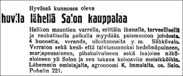 KLIKKAA KUVA ISOMMAKSI! Aitosuomalaisuudesta Salon Seudun Kunnallislehti 23.02.1926 "Aitosuomalainen kerho Saloon. Wiime lauantaina klo 6 illalla oli Salon palokunnan talon pikkusaliin kokoontunut lähes 30 kansalaista kuulemaan luutnantti Tammisen esitelmää aitosuomalaisuudesta. Esitelmää seuranneessa keskustelutilaisuudessa päätettiin perustaa paikkakunnalle Aitosuomalainen kerho. Kerhoon liittyi perustamistilaisuudessa 10 miestä." W.P.K:n Talwijuhlat Salon Seudun Kunnallislehti 23.02.1926 "— S. W. P. K:n Talwijuhlat pidetään ensi sunnuntaina alkaen jo aamulla klo 9 hiihtokilpailulla jonka lähtö tapahtuu eläin torilta ja reitti on järjestetty niin että yleisö woi koko ajan seurata kilpailuja, joita on kaikkiaan 5 eri kilpailua niin että kyllä siinä waan onkin näkemistä. Sitten illalla on iltama Palokunnan talolla, jossa ohjelma warmasti on näkemisen ja tuulemisen arvoinen." Viimeinen tanssikurssi Salon Seudun Kunnallislehti 23.02.1926 " — Hj. Lehdon toinen ja wiimeinen tanssikurssi alkaa huomenna klo 1/2 8 ip. Salon W. P. K. talolla Opetetaan sekä wanhemmat että uudemmat tanssit, myös uusin, ameriikkalainen Charlesten, joka on nykyisin muodisja. Ilmoittautua saadaan tuntia ennen kurssin alkua. Yksityistunteja sopimuksen mukaan." Oma koti Salon Seudun Kunnallislehti 23.02.1926 Ratalinjan muuttaminen Salon Seudun Kunnallislehti 26.02.1926 "Halikko Ratalinjan muuttaminen Halikon aseman luona. Maanantaina ryhdyttiin uuden linjan laittamiseen. — Wierumäen läwitse tulee tehtäwäksi tunneli. Kuten aikaisemmin on kerrottu, on rautatiehallitus päättänyt siirtää parin kilometrin werran heti Halikon aseman luota lähtevää Hajalaa päin menewää rataosaa, koska perustus tällä kohta on erittäin heikko ja maanwieremiä on jo monasti näillä seuduin tapahtunut. Maanantaina aloitettiin työt mainitulla rataosalla. Paikalla oli töissä hewosia ja parisenkymmentä miestä ja lisää wäkeä saapuu lähiaikoina. Linjaa on muutettu alkuperäisestä suunnasta parisenkymmentä metriä lähemmäksi entistä rataa. Niinkuin jo ennen on kerrottu, tulee Wierumäen lävitse tehtäwäksi tunneli, joka on kolmas Suomessa." Maaliskuu 1926Omistajalle tuntuwa wahinko Salon Seudun Kunnallislehti 02.03.1926 ![]() "Halikko Tulipalo Halikossa. Wiimelauwantaiiltana k:lo 7 tienoissa pääsi tuli irti Halikossa Hyyperän sotilaswirkatalon perunakellarissa. Tuli oli saanut alkunsa kellariin lämmitystarkoituksessa wiedystä hiilipadasta, josta tuli lewisi koko kellarirakennukseen. Tuli huomattiin melkei heti ja ryhdyttiin sammutustöihin, mutta oli tuli saanut kellarin wälikatossa olewien olkien johdosta niin suuren wallan, että sammutustyöt näyttimät alussa turhilta, mutta wäkeä saatiin puhelimitse hälyytetyksi niinpaljon palopaikalle, että kowien ponnistelujen jälkeen saatiin tulen walta rajoitetuksi. Palon aikana keskitettiin myös woimia lähellä olewien rakennusten suojelemiseen, kuten riihirakennukseen, joka oli melkein lähellä. Kellarista paloi wälilaki ja katto melkein pilolle ja arwokas sisältö joutui kokonaan tulen uhriksi. Kellarissa oli noin 127 hl. perunoita. Kellari oli wakuutettu Halikon-Angelniemen palowakutusyhtiössä mutta perin alhaisesta summasta, joten wakutus ei wastaa wahinkoja, niin että omistajalle koitui tuntuwa wahinko. Mainittakoon wielä, että kellari oli melkein uusi lähiwuosina rakennettu." Rohkenen toivoa Salon Seudun Kunnallislehti 02.03.1926