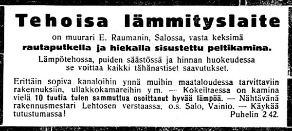 KLIKKAA KUVA ISOMMAKSI! Murhe Uusi Aura 05.01.1926 Ulkohuonerakennus urakalla Salon Seudun Kunnallislehti 08.01.1926 "— Kuttilan alakansakoulun äskettäin palaneen ulkohuonerakennuksen tilalle rakennettawan uuden ulkohuonerakennuksen rakentamisen on saanut tehtäwäkseen urakoitsija Euranen Kuusjoelta 20.000 mkn urakkasummasta." Revolveri laukesi taskussa Turun Sanomat 12.01.1926 "Tapaturma Kuusjoella Lohtotilallisen pojan Aarne Riitojan rewolmeri lauennut taskussa Wiime sunnuntaina iltapäiwällä tapahtui Kuusjoella ikäwä tapaturma. Lohkotilallisen pojalla Aarne Riitojalla Kuusjoen Kraatarlan kylässä oli taskussa wanhanaikainen amerikalainen rullarewolweri, joka jollakin tawalla wahingosla laukesi, jolloin luoti tunkeutui Riitojan watsaan. Loukkaantunut wietiin samana iltana saamaan lääkärinhoitoa Saloon ja sieltä edelleen Turun lääninsairaalaan. Eilen toimitettiin saitaalassa leikkaus. Luoti on rikkonut suolistoa, ja oli Riitojan tila eilen illalla huononpuoleinen. Riitoja on 19-muotias." Kamina Salon Seudun Kunnallislehti 15.01.1926 "Uusi keksintö lämmitysalalla. Muurari E. Rauman Uskelasta on keksinyt kaminan, jolla tulee olemaan mitä suurin taloudellinen merkitys. Uudella laitteella on tähänastisiin kaminoihin nähden se etu, että se ylläpitää tasalämpöä 10 tuntia tulen sammumisen jälkeen. Kokeiltaessa on tultu siihen tulokseen, että polttoaineen kulutus on perin pieni, noin puolet ennen tehtyjen kaminojen polttoaineiden kulutuksesta. Uusi kamina wastaa täydellisesti muurattuja peltiuuneja lämmityskykynsä puolesta, mutta puolta wähemmällä polttoaineella. Wiittaamme ilmoitukseen tämän päiwän lehdessä." Lainattavia rahoja Salon Seudun Kunnallislehti 15.01.1926 Sydämetön omistaja Salon Seudun Kunnallislehti 15.01.1926 Peltikamina Salon Seudun Kunnallislehti 15.01.1926