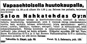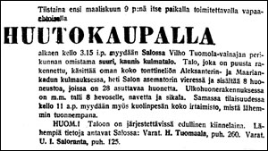 KLIKKAA KUVA ISOMMAKSI! "Tänään wihitään Halikon piirimielisairaala. Halikon piirimielisairaalan päärakennus. Ylinnä julkipuoli ja alempana rakennuksen takasiwu." Pitkä kirjeenkulku Uusi Aura 30.01.1926 Helmikuu 1926Kappalaisen halot Salon Seudun Kunnallislehti 02.02.1926 Tulipalo Salossa Uusi Aura 03.02.1926 Aivan tukossa Salon Seudun Kunnallislehti 05.02.1926 Myyty Salon Seudun Kunnallislehti 05.02.1926 "Osuuskaupan kahwila myyty. Keskiwiikkona tehdyllä kauppakirjalla on neiti Katri Honko myynyt Salon Seudun Ojuuskaupan talossa omistamansa kahwilan maanwiljelijä Jalmari Lönnqwistille Uskelasta. Wastaanotto tapahtui heti. Salon Uusi Kemikalikauppa myyty. Äskettäin tehdyllä kauppakirjalla on apt. J. H. Fernelius myynyt täällä omistamanja Salon Uusi Kemikalikauppa-nimisen liikkeen farmaseutti Pekka Forssellille Hämeenlinnasta. Wastaanotto oli t.k. 1 pnä." Huutokaupalla Turun Sanomat 06.02.1926