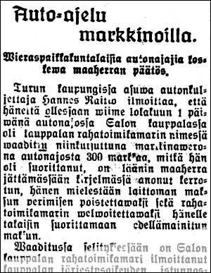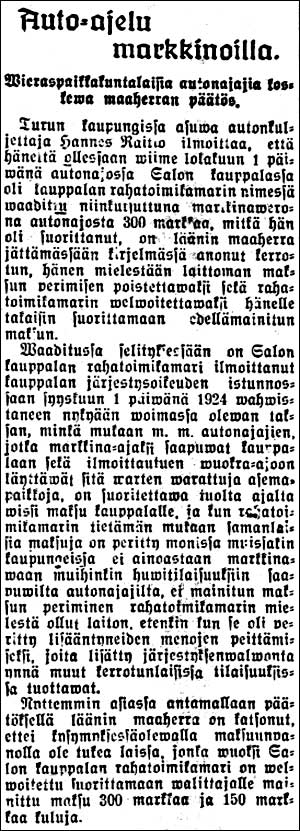 KLIKKAA KUVA ISOMMAKSI! "Auto-ajelu markkinoilla. Wieraspaikkakuntalaisia autonajajia koskewa maaherran päätös. Turun kaupungissa asuwa autonkuljettaja Hannes Raitio ilmoittaa, että häneltä ollessaan wiime lokakuun 1 päiwänä autonajossa Salon kauppalassa oli kauppalan rahatoimikamarin nimessä waadittu niinkutsuttuna markkinawerona autonajosta 300 martkaa, mitkä hän oli suorittanut, on läänin maaherra jättämässään kirjelmässä sanonut kerrotun, hänen mielestään laittoman maksun perimisen poistettawaksi setä rahatoimikamarin welwoitettawaksi hänelle takaisin suorittamaan edellämainitun maksun. Waaditussa selityksessään on Salon kauppalan rahatoimikamari ilmoittanut kauppalan järjestysoikeuden istunnossaan syyskuun 1 päiwänä 1924 wahwistaneen nykyään woimaswa olewan taksan, minkä mukaan m. m. autonajajien, jotka markkina-ajaksi saapuwat kauppalaan sekä ilmoittautuen wuokra-ajoon käyttäwät sitä warten warattuja ajemapaikkoja, on suoritettawa tuolta ajalta wissi maksu kauppalalle, ja kun rahatoimikamarin tietämän mukaan samanlaisia maksuja on peritty monissa muissakin kaupungeissa ei ainoastaan markkina waan muihinkin huwitilaisuuksiin saapuwilta autonajajilta, ei mainitun maksun periminen rahatoimikamarin mielestä ollut laiton, etenkin kun se oli peritty lisääntyneiden menojen peittämiseksi, joita lisätty järjestyksenwalwonta ynnä muut kerrotunlaisissa tilaisuuksissa tuottawat. Nyttemmin asiassa antamallaan päätöksellä läänin maaherra on katsonut, ettei kysymyksessäolewalla maksuunpanolla ole tukea laissa, jonka wuoksi Salon kauppalan rahatoimikamari on welwoitettu suorittamaan walittajalle mainittu maksu 300 markkaa ja 150 markkaa kuluja. " Koulujen wäliset Turun Sanomat 21.03.1926 "Halikko. Kansakoulujen wäliset hiihtokilpailut Halikossa. Wiime lauantaina pidettiin Halikossa Nummen kansakoululla koulujen wäliset hiihtokilpailut. Tällä kerralla oliwat osanottajina Pajulan, Kihisten, Wartsalan ja Nummen koulut joista kustakin koulusta oli 10 osanottajaa, joista 5 parhaan hiihtäjän saawuttama yhteistulos otettiin huomioon. Matka oli 2 km. Koulujen wälinen järjestys oli: 1) Pajulan koulu 53,28. 2) Wartsalan koulu 53,51. 3) Kihisten koulu 55,13. 4) Nummen koulu 62,36. Tyttöjen kesken kilpailtawasta kiertopalkinnosta kilpailiwat samalla kertaa Nummen, Kihisten ja Wartjalan koulut 1 kmn matkalla. Ottaen 3 tyttöoppilaan tuloksen huomioon tuli koulujen järjestys seuraawaksi: 1) Kihisten koulu 19,56. 2) Wartsalan koulu 23,37. 3) Nummen koulu 23.41." Varoineen ja velkoineen Uusi Aura 23.03.1926 Kahwila Stella Turun Sanomat 24.03.1926 " — Kahwila Stella Salossa. Läänin maaherra on oikeuttanut Uskelan pitäjässä ajuwan tilallisen Jalmari Lönnwistin harjoittamaan Salon kauppalassa ruokala- ja kahwilaliikettä toiminimellä "Kahwila Stella"." Katuja kivettäviksi Uusi Aura 24.03.1926 Kainojen köyhäin koti Uusi Aura 24.03.1926 Vulkanoimisosasto Uusi Aura 28.03.1926 Elatusawustusta Salon Seudun Kunnallislehti 30.03.1926 " — Elatusapua wanhalle työmiehelle. Tehdystä hakemuksesta läänin maaherra on welwoittanut Wartsala Ångsågs Aktiebolag-nimisen yhtiön suorittamaan sekatyömies Juho Kustaa Niemiselle, joka on ollut yhtiön palweluksessa noin 37 wuoden ajan ja sinä aikana tullut niin kiwuloiseksi ja kykenemättömäksi ettei hän woi itseään elättää, elatusawustusta 700 markkaa kuukaudessa wiime helmikuun 1 päiwästä alkaen." Vaatturiliike Halikon aseman lähellä Salon Seudun Kunnallislehti 30.03.1926 Huhtikuu 1926J.Lehden lyhyttavaraliikkeeseen Salon Seudun Kunnallislehti 01.04.1926 Pirtukuljettajan kuolema Salon Seudun Kunnallislehti 01.04.1926 "Pirtunkuljettajan kuolema Westanfjärdissä. Lääkärintarkastuksessa osoittautui, että Waldemar Hemmingin kuoleman aiheutti sydämenhalwaus. Kuten aikoinaan kerrottiin, tawattiin t.k. 11 pnä Westanfjärdissä jäältä kuolleena halikkolainen Waldemar Hemming. Hän oli ollut pirtumatkoilla yhdessä angelniemeläisen Lindwallin kanssa, ja oliwat he t.k. 10 pnä illalla pudonneet heikkoihin jäihin. Molemmat oliwat päässeet ylös railosta, mutta oli Lindwall jättänyt Hemmingin jäälle, josta tämä sitten seuraawana aamuna tawattiin kuolleena. Kun Lindwall esiintyi tässä jutussa hywin epäilyttäwässä walossa, pidätettiin hänet siksi, kunnes ruumiinleikkaus antaisi lähemmän selwyyden tähän hämäräperäiseen kuolemantapaukseen. Wiime perjantaina suoritetussa ruumiinleikkauksessa todettiin, että Hemmingin kuoleman aiheuttajana oli sydämenhalwaus. Epäilykset Lindwallia wastaan häipyiwät tämän johdosta ja laskettiin hänet heti wapaalle jalalle. Lindwallia tullaan kuitenkin syyttämään ensi talvikäräjilä siitä, että hän oli jättänyt awun tarpeessa olewan towerinsa jäälle." Pappa Wellenius myy Salon Seudun Kunnallislehti 01.04.1926 Epäsiwellisyyspahe Salon Seudun Kunnallislehti 01.04.1926