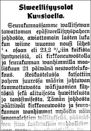 LUE KOKO TEKSTI, KLIKKAA ISOMMAKSI! "Siweellisyysolot Kuusjoella. Seurakunnassamme wallitsewan tawattoman epäsiweeliisyyspaheen johdosta, awiottomain lasten luku kun wiime wuonna nousi lähes 1/4 osaan eli 23,2 %/:iin kaikista syntyneistä, oli kirkkoneuwostolla ja seurakunnan wanhimmilla maaliskuun 21 päiwänä neuwottelukokous. Keskustelussa katsottiin paheen suuressa määrin johtuvan kammottawasta wäkijuomien käytöstä sekä alituisesta huwittelusta ja tanssimisesta. Tämän johdosta päättiwät kirkkoneuvosto ja seurakunnan wanhimmat myöskin näin sanomalehtien wälityksellä, päästäkseen siten kosketuksiin mahdollisimman monen seurakuntalaisen kanssa, yhteisesti wedota seurakunnan koteihin, isiin ja äiteihin, että he kukin kohdaltansa päättäisiwät, ettei heidän kodissaan eikä perhekuntansa jäsenten piirissä saa wäkijuomilla olla mitään sijaa, sekä vedota edistysseuroihin ja yhdistyksiin, kuten työwäenyhdistyksiin, nuorisoseuraan, suojeluskuntaan, Lotta Swärd-yhdistyksen, maamiesseuraan, pienwiljelijä-yhdistykseen, kansallisseuraan y.m. että ne pannessaan toimeen iltamia toimisiwat aatteellisella, nuorisoa kohottawalla ohjelmalla ja jättäisiwät pois tanssin tai ainakin supistaisiwat sen mahdollisimman wähiin ja lopetettawaksi päiwäseen aikaan. Kun on kysymyksessä nuorisomme tulewaisuus, sen ajallinen menestys ja sen ijäijyys ja kun nykyinen meno uhkaa kansallemme turmiota ja perikatoa, tohtiwat kirkkoneuwosto ja seurakunnan wanhimmat toiwoa, että itsekukin käsittää asian wakawuuden ja piirissään walwoo järjestystä, hywiä tapoja ja nuorisonsa tosi parasta. Emme myöstään woi olla huomauttamatta, että Herran pelko on wiisauden alku, jotenka kaikkien seurakuntalaisten ahkera Jumalan sanan wiljely kodissa ja seurakunnan yhteydessä siinä rukouksen hengessä, että Jumala awaisi sydämemme ottamaan wastaan hänen sanansa, on paras apu nuorisomme nousemiseksi siweellisestä alennustilasta" "Keskustelussa katsottiin paheen suuressa määrin johtuvan kammottawasta wäkijuomien käytöstä sekä alituisesta huwittelusta ja tanssimisesta." Kyl toi tanssimine ja alituinen huvittelu o niimpal kauhiaa... Vuokralle annetaan Salon Seudun Kunnallislehti 01.04.1926 Ilmoitus Salon Seudun Kunnallislehti 09.04.1926 Lantaruuma Salon Seudun Kunnallislehti 09.04.1926 Tyytywäisyys hattuihin Salon Seudun Kunnallislehti 09.04.1926 "Tyytywäisiä hattujen ostajia. Sekä Salosta että maaseutu ympäristöltä owat naiset käyneet oikein joukoissa tutustumassa Turun muotiliikkeessä, joka liike on awannut muotikaupan Salossa Satulaseppä Lindqwistin talossa Itäinen Siltakatu 11. Tyytywäisyys Turun Muotiliikkeen hattuihin johtunee etupäässä siitä, kuten jotkut owat wäittäneet, että kaikki hatut owat jollakin tawalla erilaisia ja samalla aistikkaasti walmistettuja kuten suurkaupunkien muotiliikkeissä. Wanhoja hattuja myös korjataan ja puetaan uudelleen." Aikataulu Salon Seudun Kunnallislehti 13.04.1926 Vaihtelevalla ohjelmalla Salon Seudun Kunnallislehti 13.04.1926 Palvelukseen otetaan Salon Seudun Kunnallislehti 13.04.1926 Melkein uusi Salon Seudun Kunnallislehti 13.04.1926 Kiellän Salon Seudun Kunnallislehti 13.04.1926 Heti autokelin tultua Salon Seudun Kunnallislehti 13.04.1926 Uskelassa Uusi Aura 15.04.1926 Hyvästijättötilaisuus Salon Seudun Kunnallislehti 16.04.1926 Pahoinpitelyjuttu Salon Seudun Kunnallislehti 16.04.1926 "Halikko Helmikuinen pahoinpitelyjuttu Waskiolla. Kuten ennen on mainittu, rusikoiwat renki Iwar Lundström sekä lohtotilallisen pojat Wäinö W. Wirtanen ja Yrjö A. Uusikartano Halifon Sauwon kylästä yöllä helmik. 28 päiwää wastaan lohkotilallisen poikaa Kaarlo Kosti Lainetta niin pahoin, että hän potee saamiaan wammoja wieläkin. Juttu oli eilen esillä Halikon wälikäräjillä, mutta lykkääntyi wielä lopullisen lääkärinlausunnon saamista warten. Pojat tunnustiwat tekonja eikä mitään muutakaan uutta tullut asiassa esille." Waskion meijeri Salon Seudun Kunnallislehti 16.04.1926 "Waskion osuusmeijerin rakentaminen Koneisto ostettu Hankkijalta. Waskion osuusmeijerin rakennustoimikunnan kokouksessa maanantaina päätettiin ostaa meijeriin uusi koneisto Keskusosuusliike Hankkijalta. Koneisto, joka on Astra-mallia, maksaa 280,000 markkaa. Niinkuin aikaisemmin on kerrottu, rakennetaan meijerille parhaallaan uutta liikehuoneistoa. Näin ollen tulee meijeri kaikin puolin ensiluokkaiseksi ja ajan waatimuksia wastaawaksi." Merikulman siirto Uusi Aura 17.04.1926