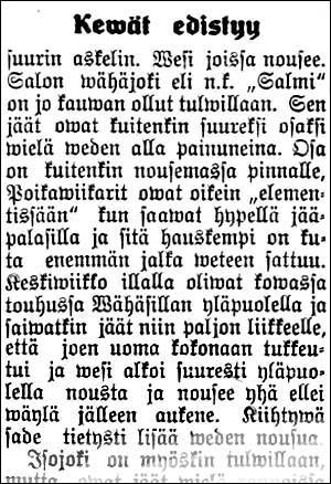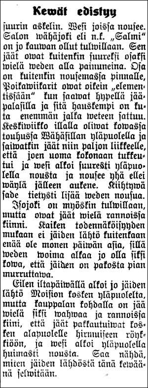LUE KOKO TEKSTI, KLIKKAA ISOMMAKSI! "Kewät edistyy suurin askelin. Wesi joissa nousee. Salon wähäjoki eli n.k. "Salmi" on jo kauwan ollut tulvillaan. Sen jäät owat kuitenkin suureksi osaksi wielä weden alla painuneina. Osa on kuitenkin nousemassa pinnalle. Poikawiikarit owat oikein "elementissään" kun saavat hypellä jääpalasilla ja sitä hauskempi on kuta enemmän jalka weteen sattuu. Keskiwiikko illalla oliwat kowassa touhussa Vähäsillan yläpuolella ja saiwatkin jäät niin paljon liikkeelle, että joen uoma kokonaan tukkeutui ja wesi alkoi suuresti yläpuolella nousta ja nousee yhä ellei wäylä jälleen aukene. Kiihtywä sade tietysti lisää weden nousua. Isojoki on myöskin tulwillaan, mutta owat jäät wielä rannoissa kiinni. Kaiken todennäköisyyden mukaan ei jäiden lähtö kuitenkaan enää ole monen päiwän asia, sillä weden woima alkaa jo olla siksi kowa, että jäiden on pakosta pian murruttava. Eilen iltapäiwällä alkoi jo jäiden lähtö Moision kosken yläpuolelta, mutta kauppalan kohdalla on jää wielä siksi wahvaa ja rannoissa kiinni, että jäät pakkautuwat kosken alapuolelle hirmuiseen röykkiöön, ja wesi alkoi yläpuolella huimasti nousta. Saa nähdä, miten jäiden lähdöstä tänä kewäänä selwitään." Joki tulvimassa Uusi Aura 23.04.1926 Piirimielisairaalaan Salon Seudun Kunnallislehti 27.04.1926 Halikon osuuskassa Salon Seudun Kunnallislehti 27.04.1926 Alkaen klo ½8 ip. Salon Seudun Kunnallislehti 27.04.1926 Neljän päivän mies Salon Seudun Kunnallislehti 27.04.1926 Autoliikenne Salon Seudun Kunnallislehti 30.04.1926 "Autoliikenne Waskion tiellä. Maaherra on antanut päätöksen Halikon pitäjässä olewan Waskion tien tientekowelwollisten anomuksesta, että automobiililiikenne kuorma- ja linja-automobiileillä sanotulla tiellä kiellettäisiin kesäkuun 1 päiwään asti, kieltäen sanotunlaisen liikenteen kysymyksessäolewalla tiellä siihen asti, että tiellä olewat sillat ja rummut on saatu kuntoon, ei kuitenkaan pitemmäksi ajaksi kuin kuluwan wuoden kesäkuun 1 päiwään." Ojatyö Puotilassa Salon Seudun Kunnallislehti 30.04.1926 Puhelinlankaa Salon Seudun Kunnallislehti 30.04.1926 Mihin wappuna Salon Seudun Kunnallislehti 30.04.1926 "Mihin salolaiset menewät Wappuna. Rauhallisin ja wiihtyisin paikka Salossa wiettää vappua on ehdottomasti Lottien kahwila Suojeluskunnan talolla. Siellä tarjoutuu tilaisuus, ilmoista huolimatta, lyöttäytyä istumaan useampaan eri paikkaan. Kahwia, simaa, glassia y.m. hywää saa nauttia laulun ja soiton säwelten kaikuessa klo 7 a.p. alkaen. Suuri sali ja lasiweranda on tilaisuutta warten erikoisesti koristettu, konsetteja, serpentiinejä sekä muuta ylimääräistä uutuutta myytäwänä, mitkä kaikki lisääwät ja nostattawat wapputunnelmaa." Katselmus Salon Seudun Kunnallislehti 30.04.1926